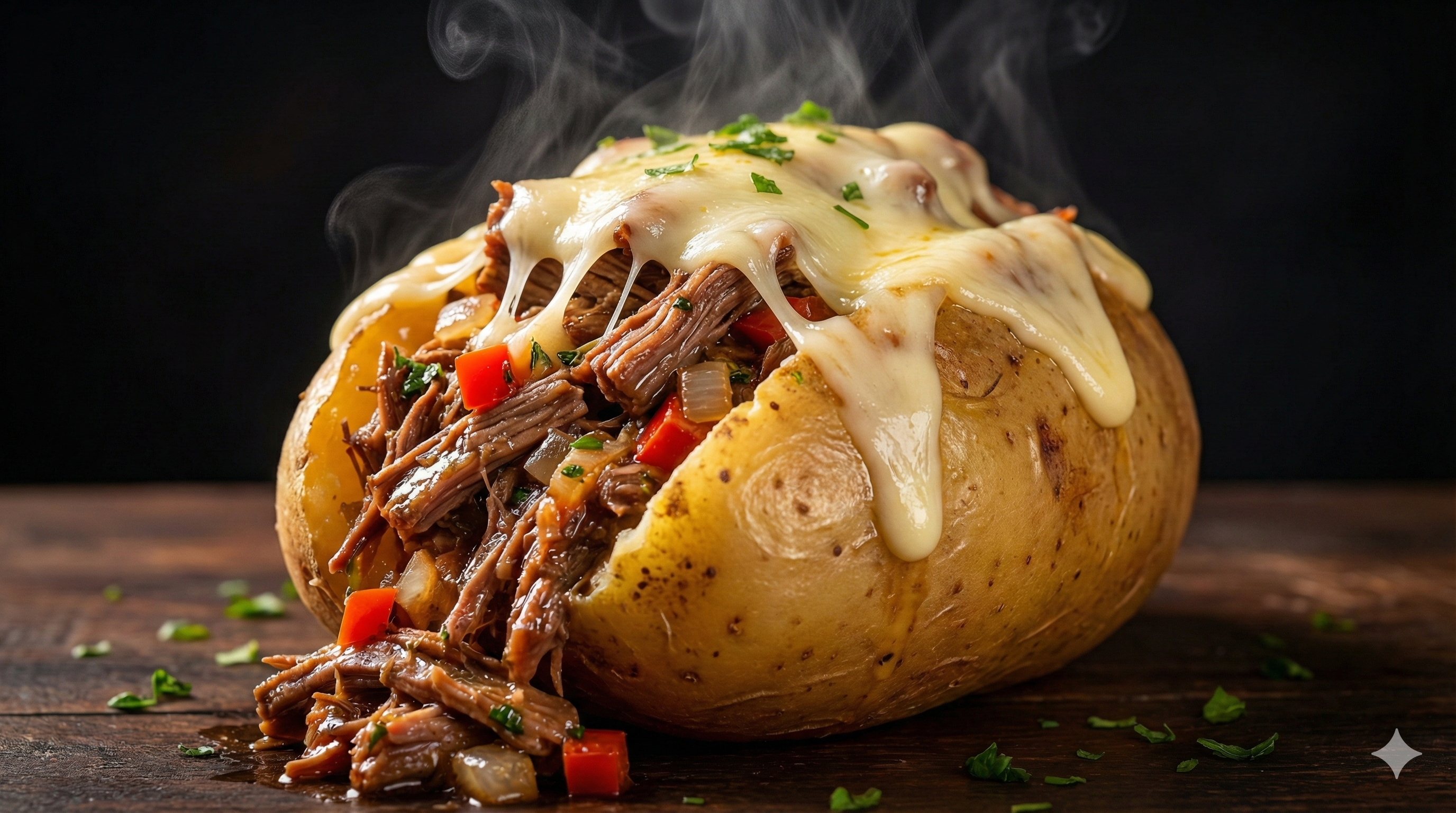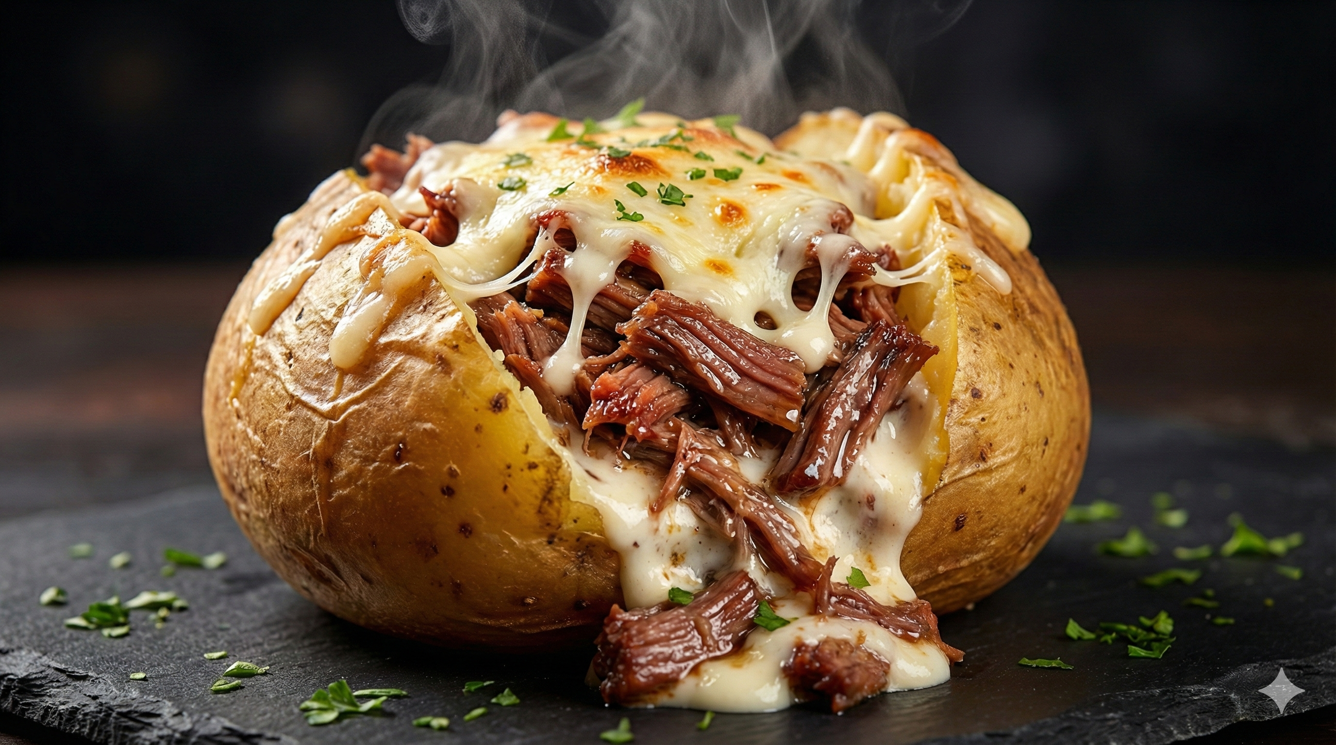 Batata cozida com molho branco carne de sol desfiada e mussarela por cima.