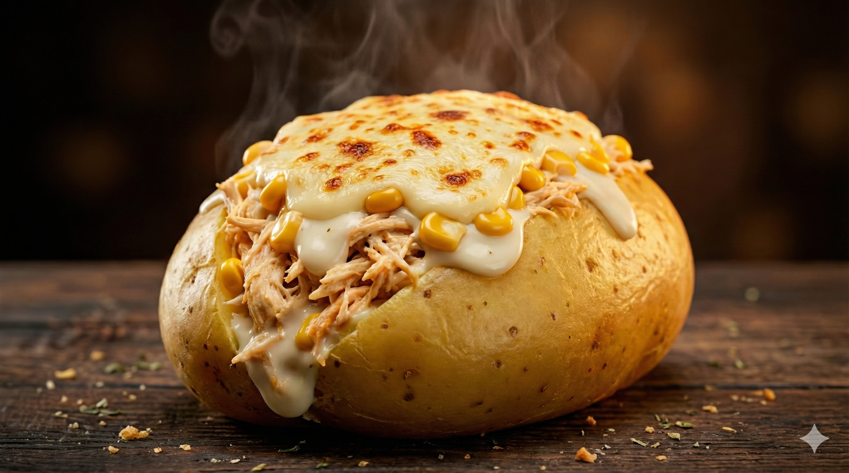 Batata cozida com frango cremoso, mussarela e catupiry + milho verde.