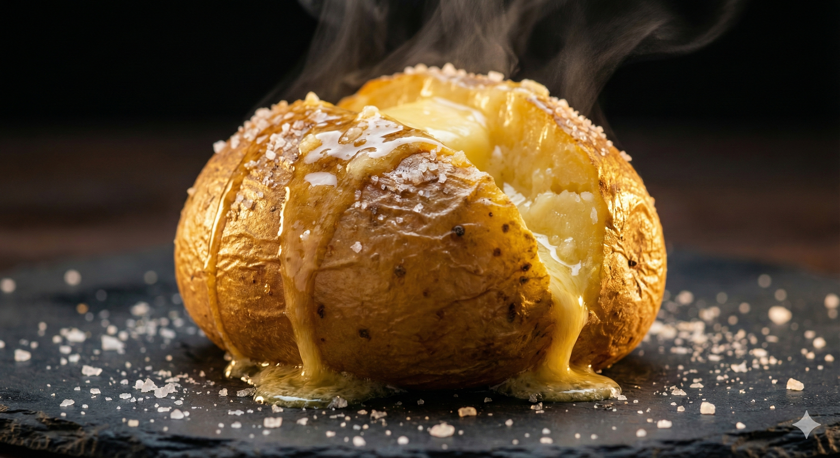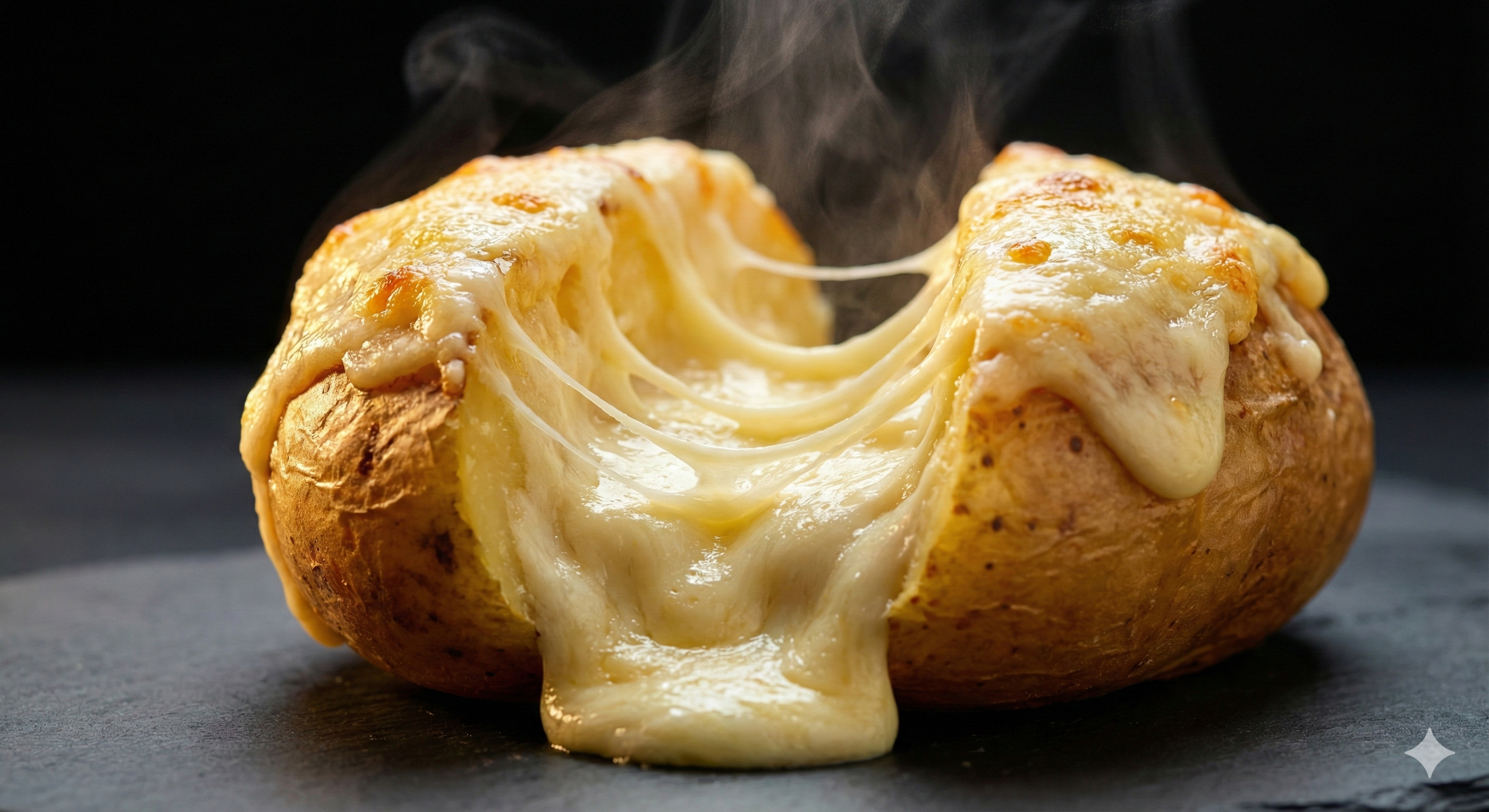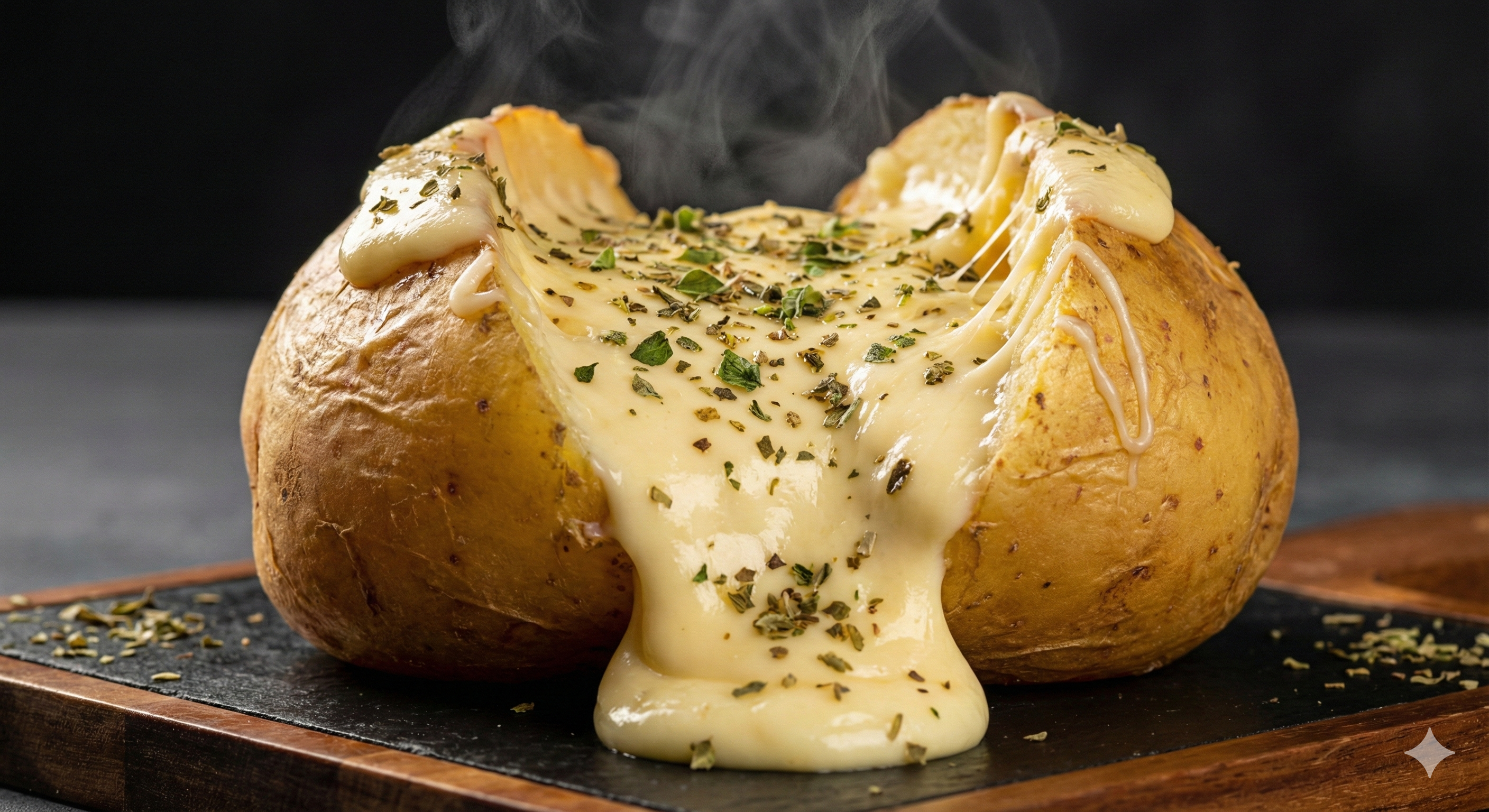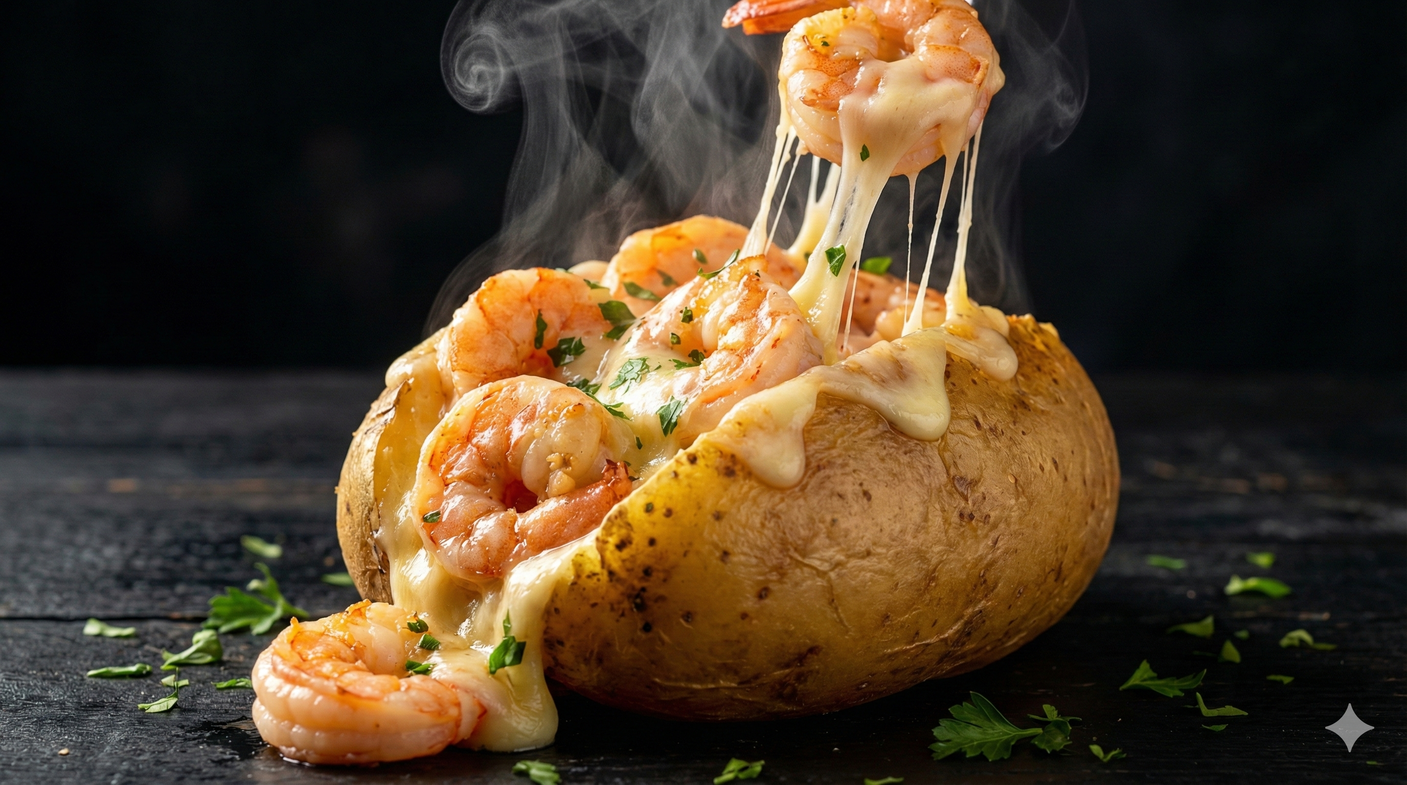 batata cozida recheada com camarão ao molho branco e mussarela por cima.