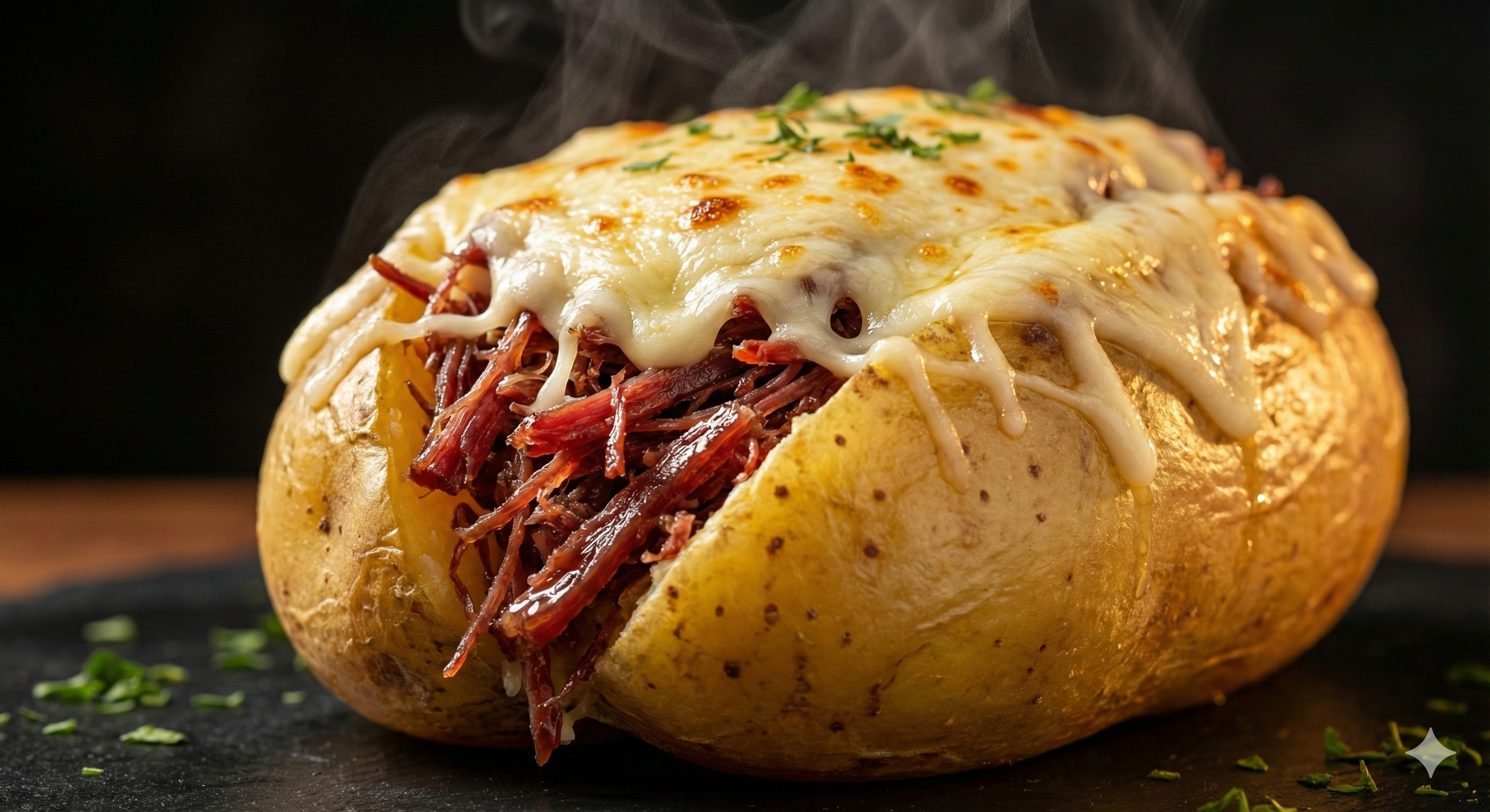 batata cozida recheada com carne seca e queijo mussarela por cima.