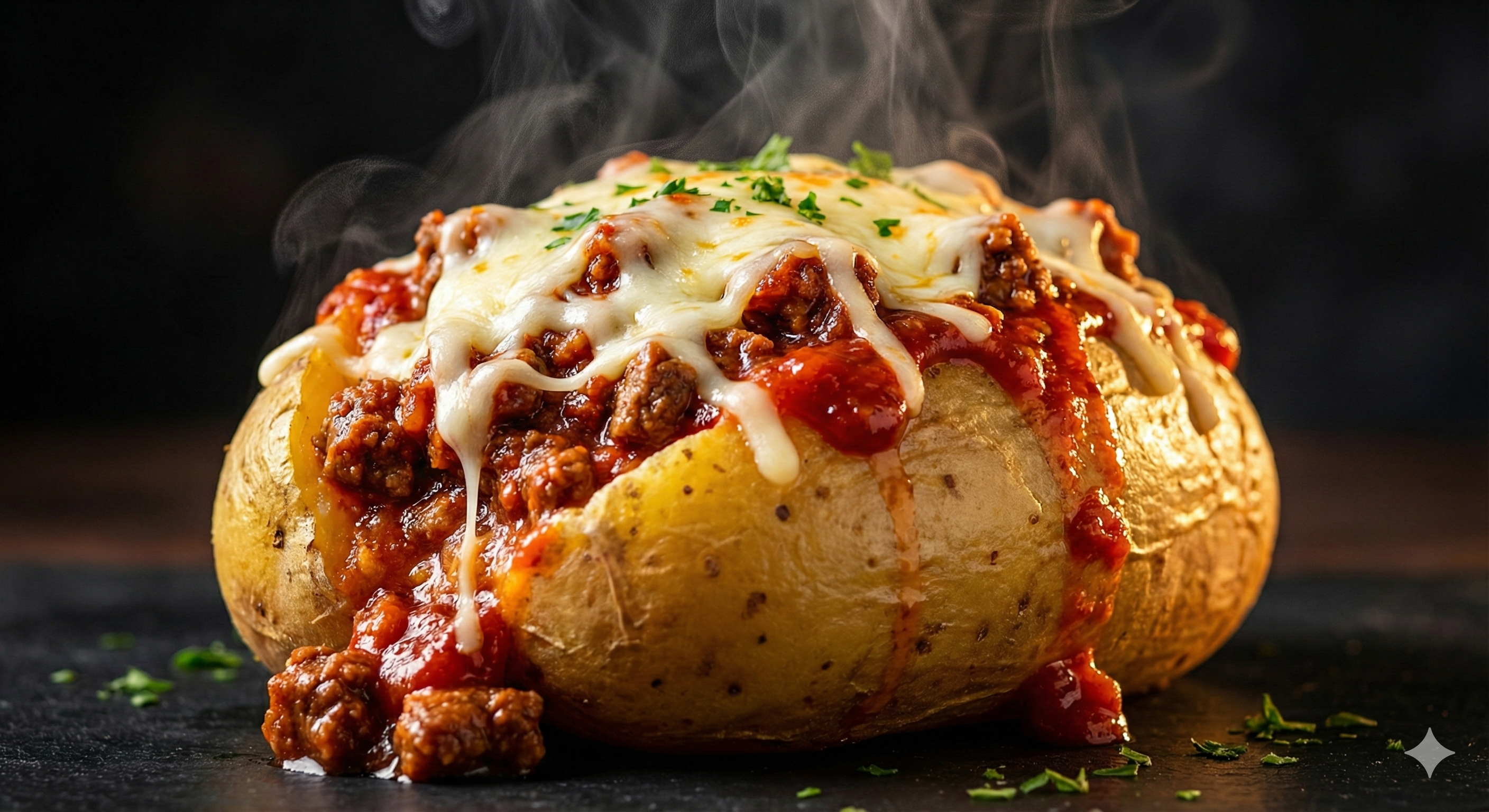 Batata perfeitamente cozida com molho bolonhesa e queijo mussarela por cima.