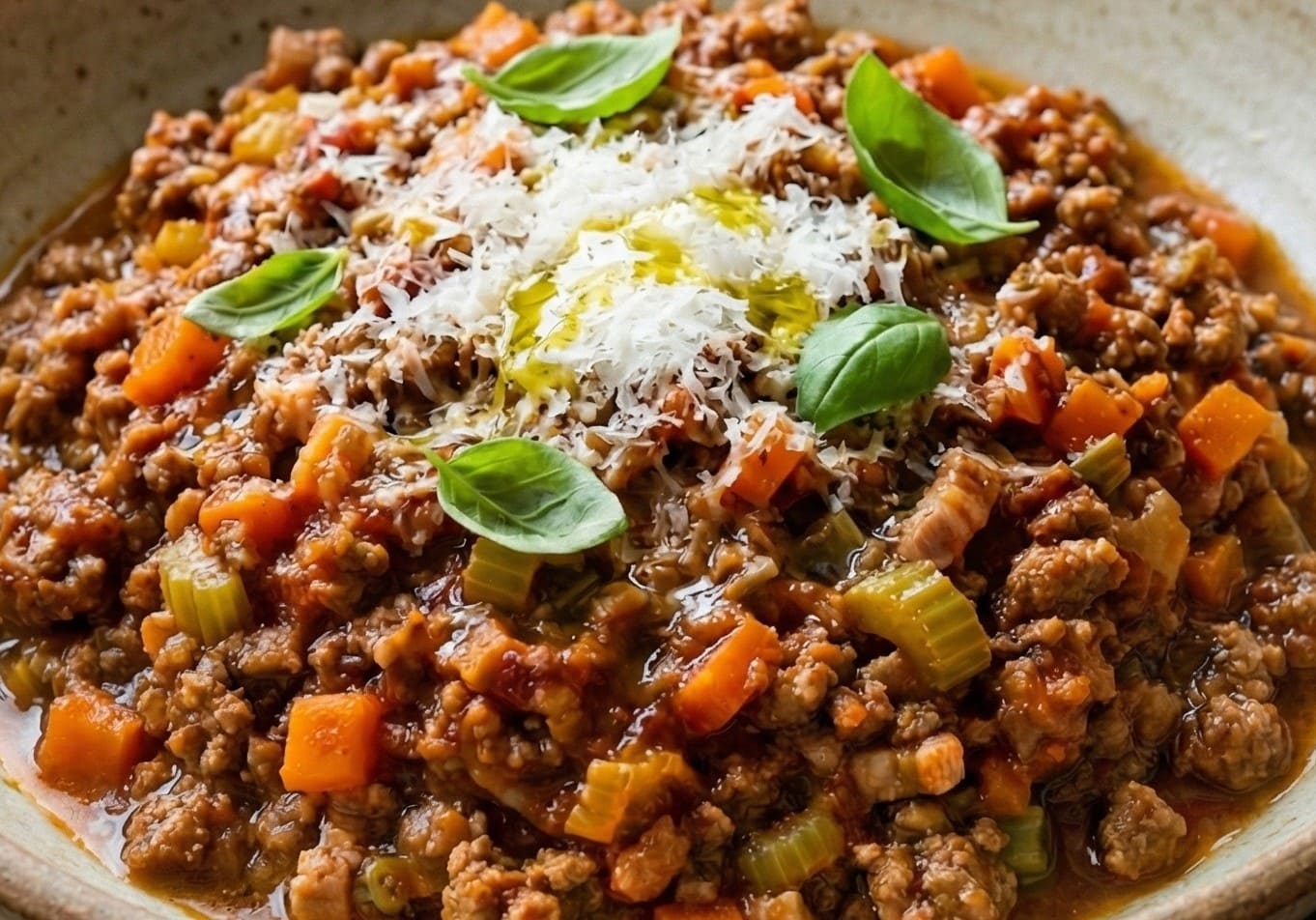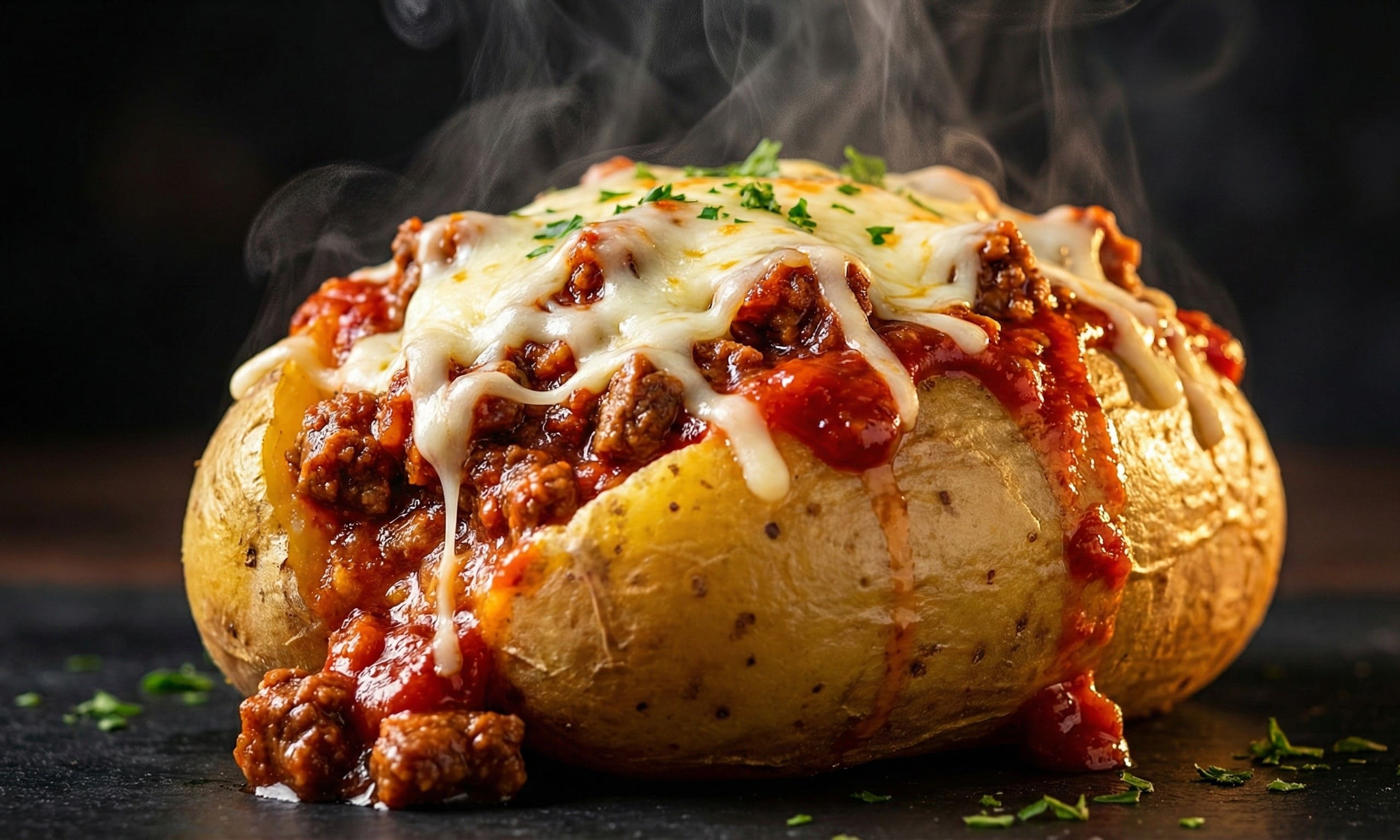 Batata perfeitamente cozida com molho bolonhesa e queijo mussarela por cima.