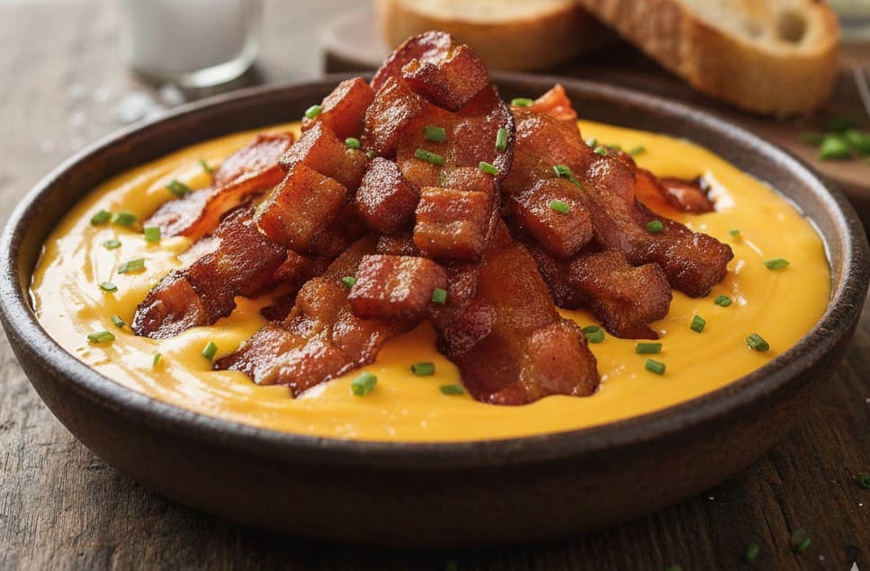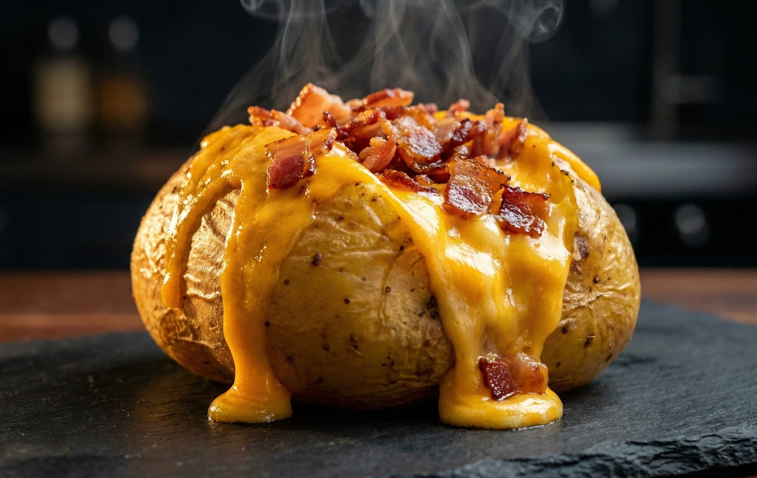 Batata cozida recheada com cheddar original e bacon por cima.