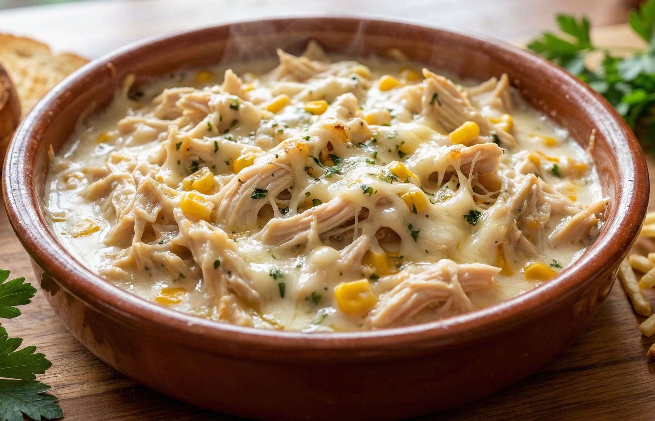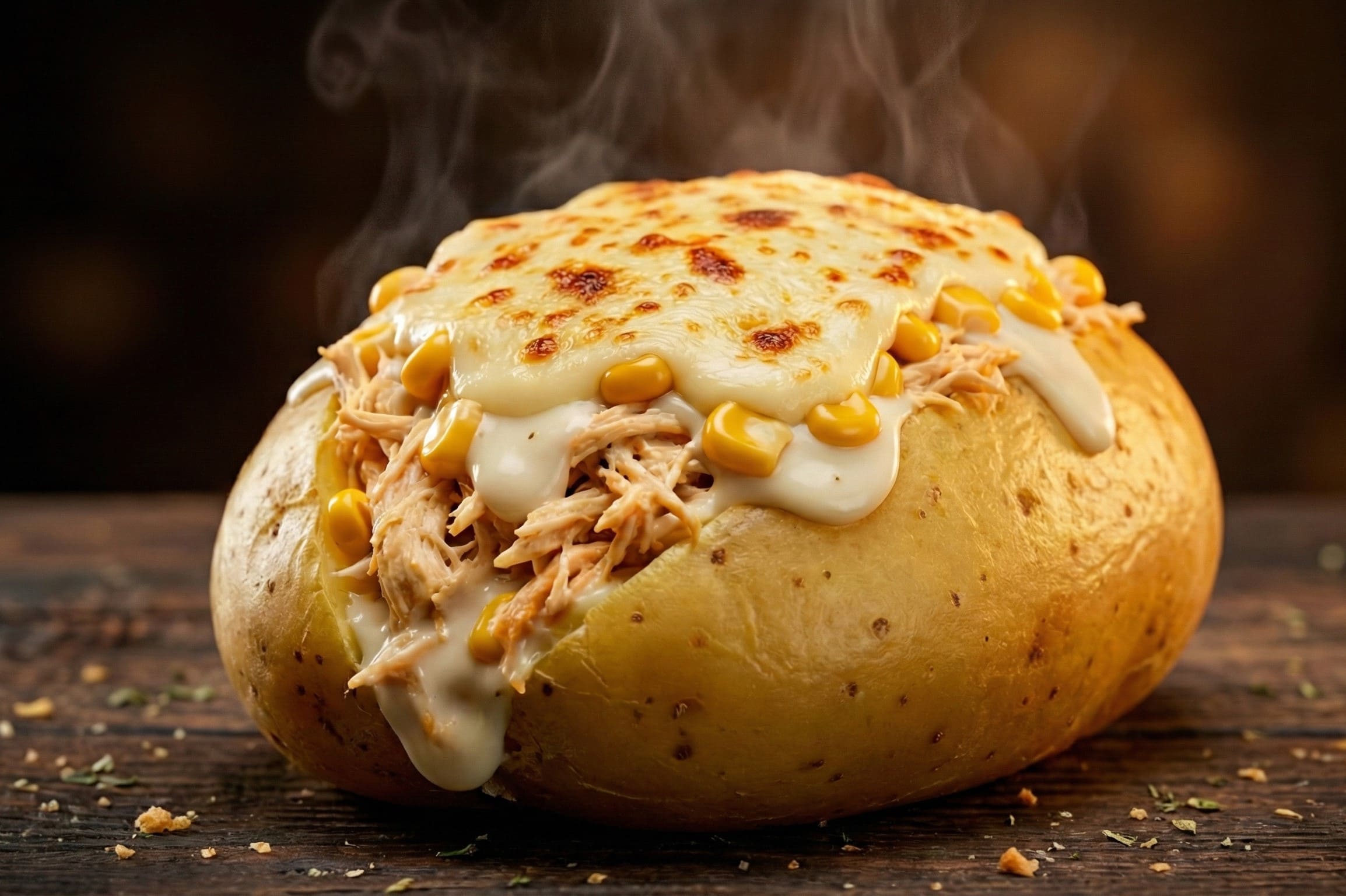 Batata cozida com frango cremoso, mussarela e catupiry + milho verde.