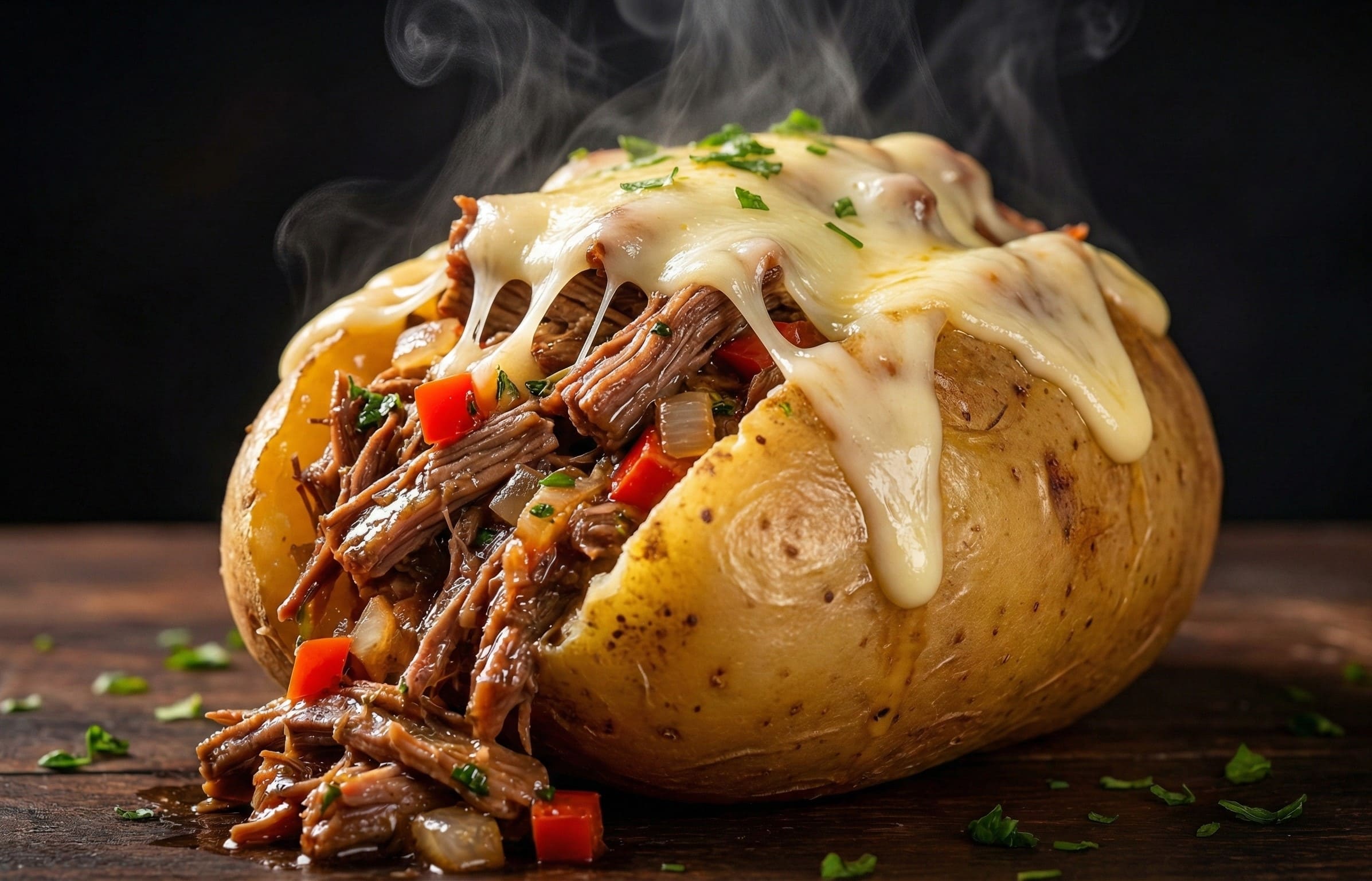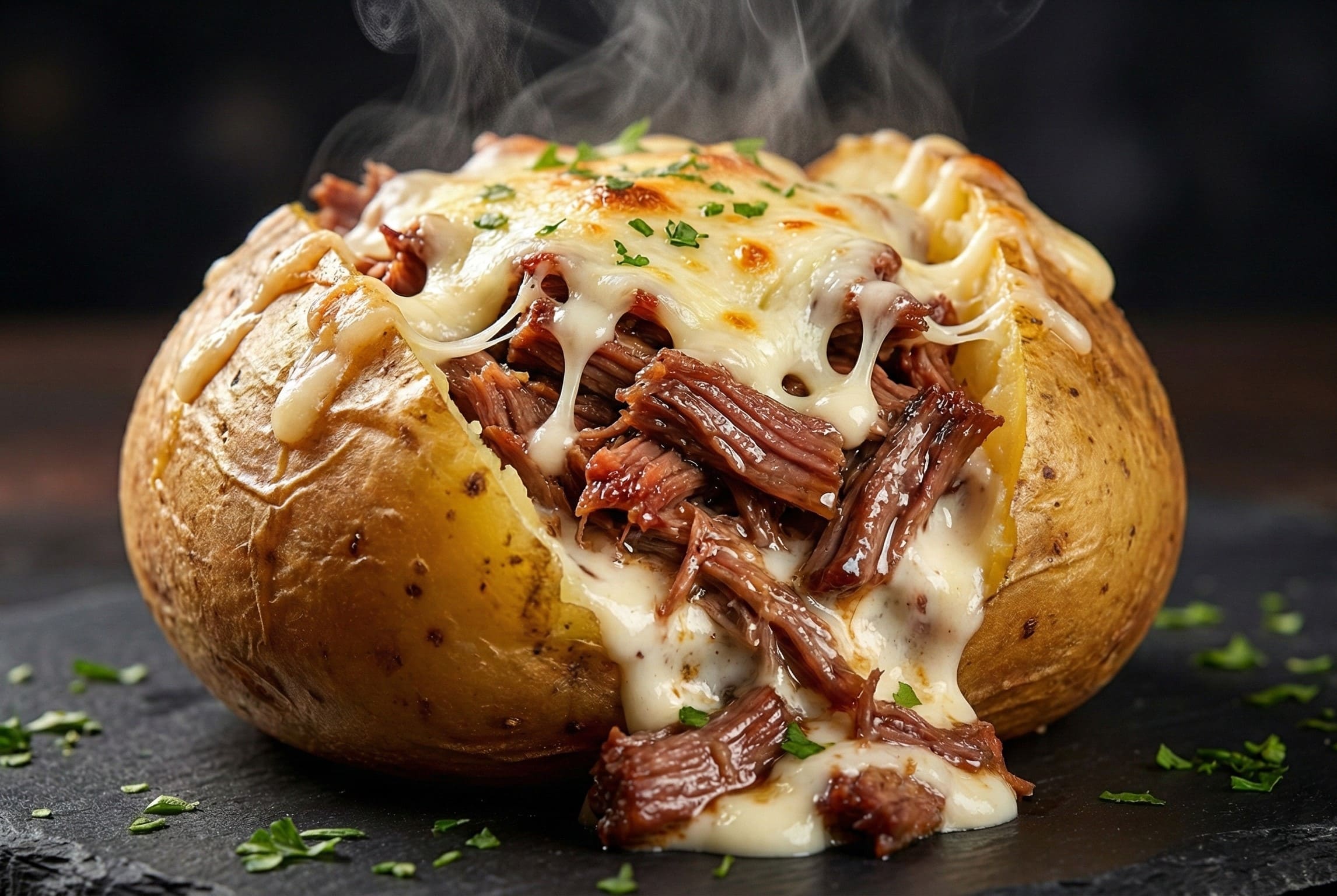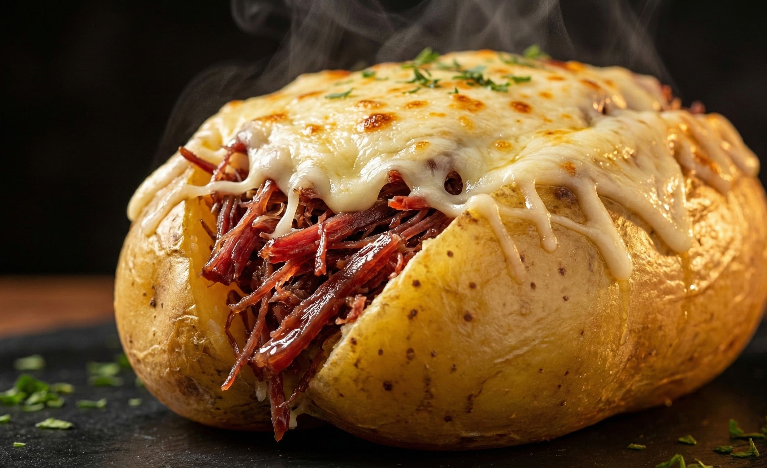 Batata cozida recheada com carne louca e mussarela.