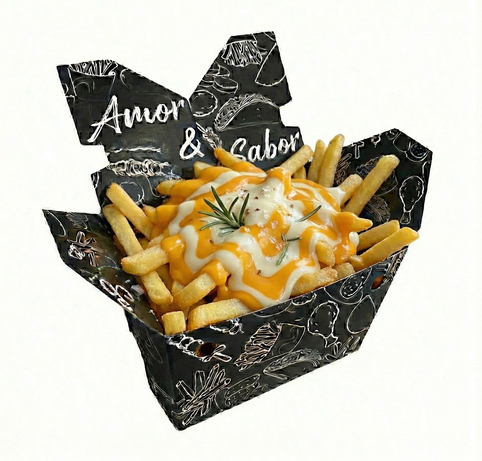 Batata frita acompanhada com cheddar e Catupiry 500g.