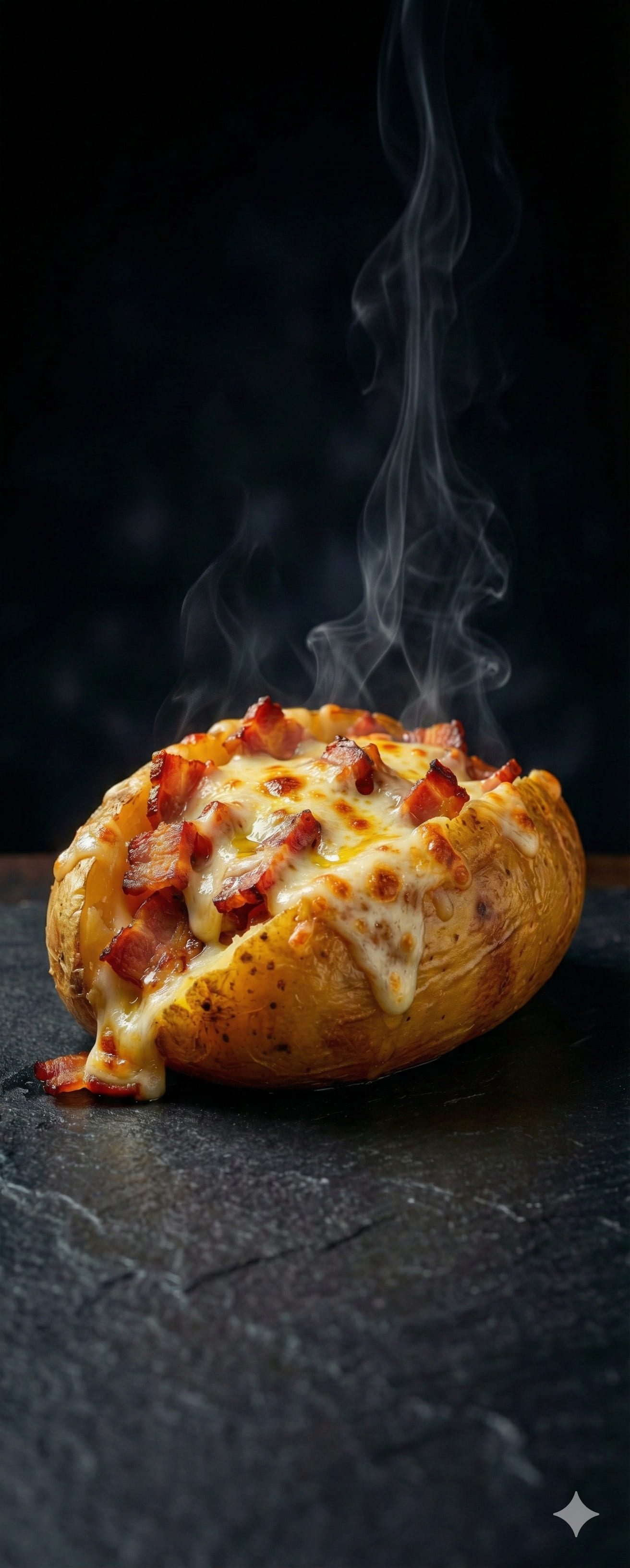 Batata cozida recheado com bacon e mussarela gratinada.
