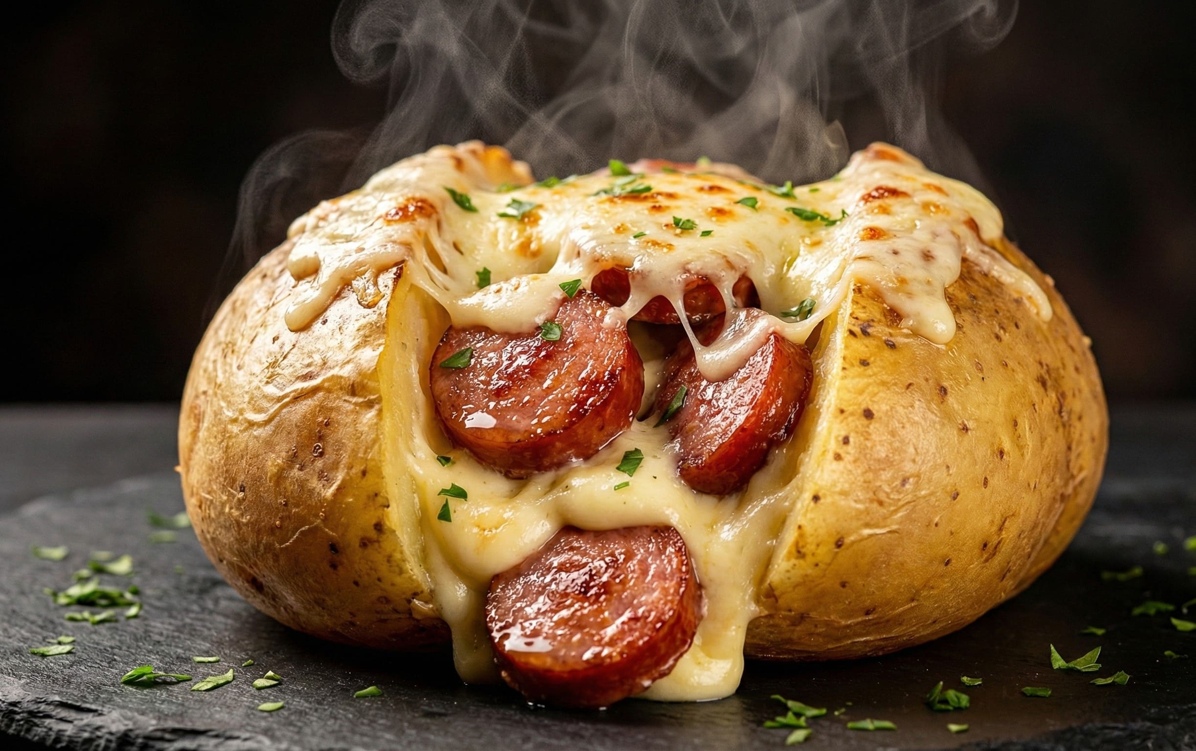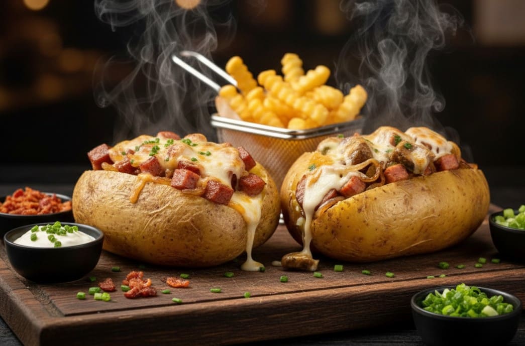 Batata cozida recheada com calabresa e catupiry.