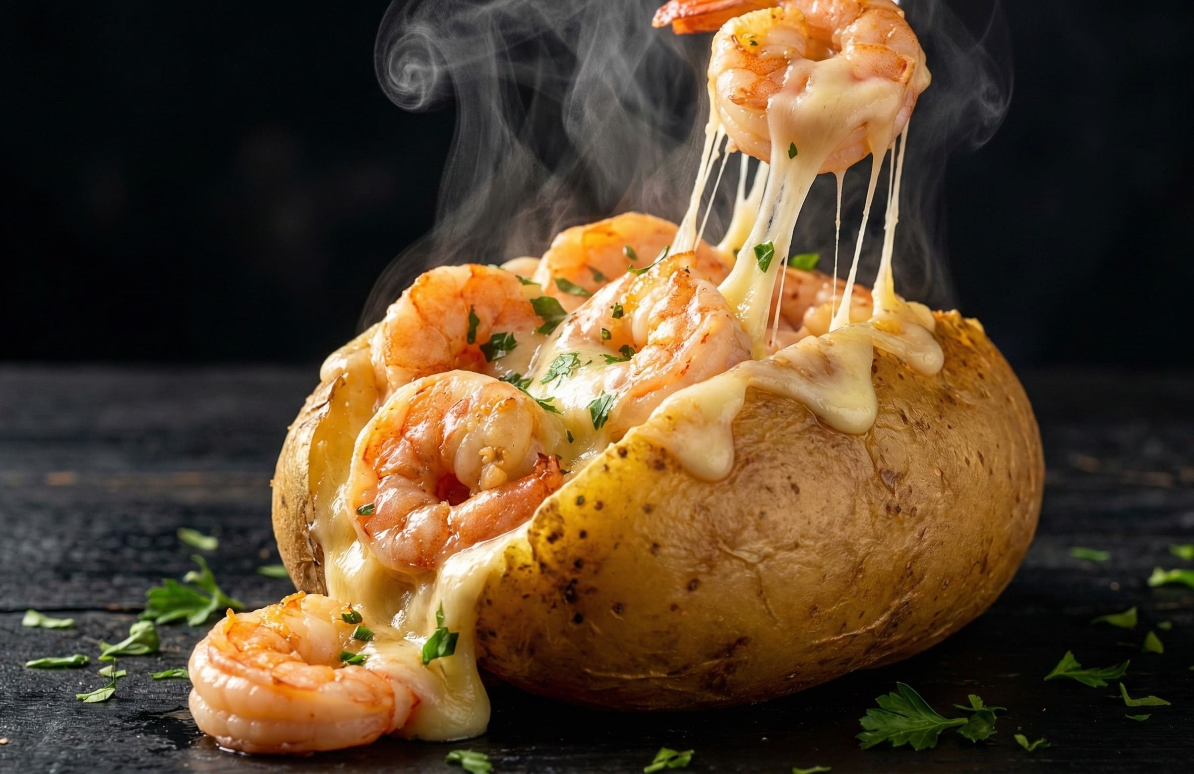 Batata cozida recheada com camarão ao molho branco e mussarela por cima.