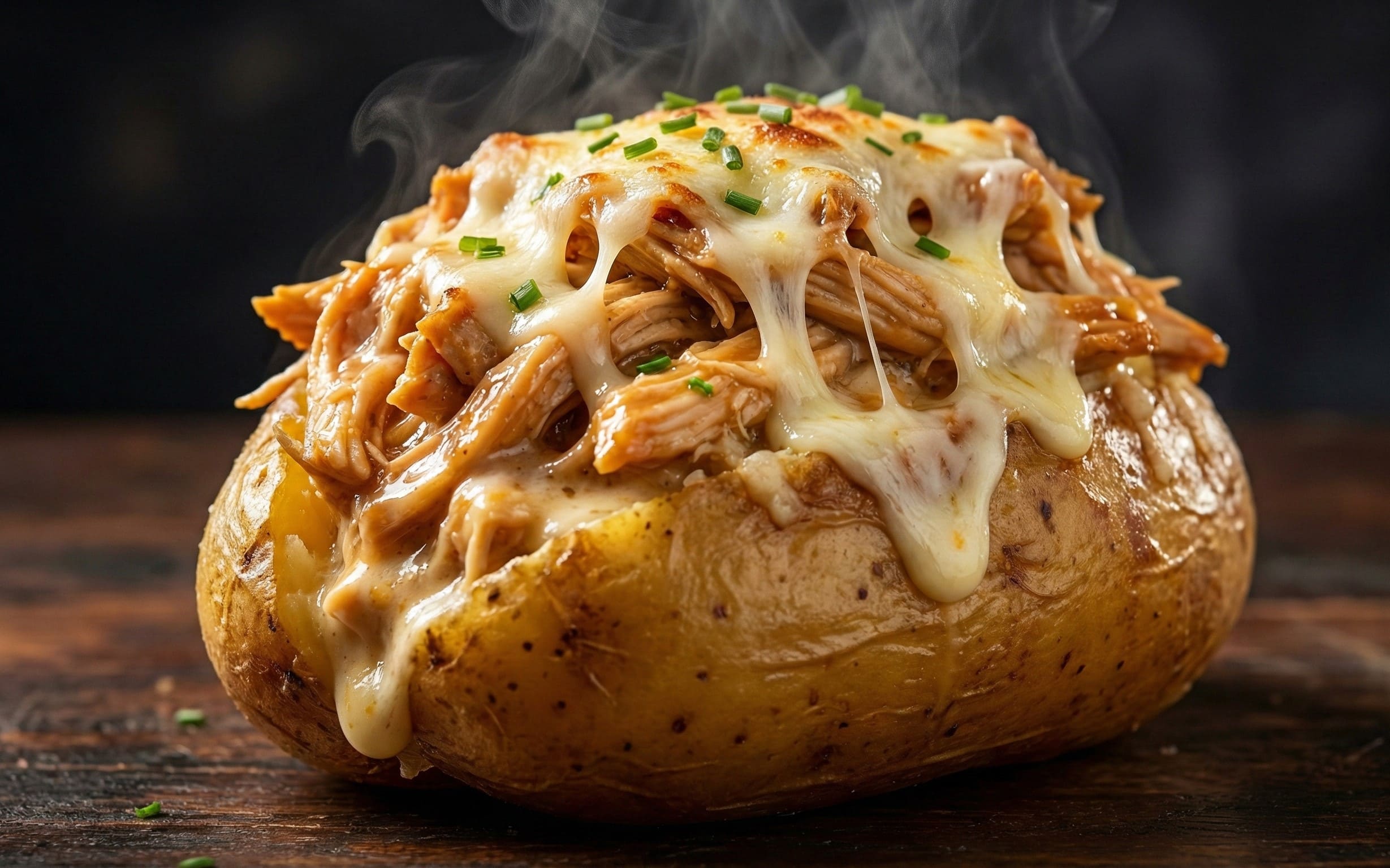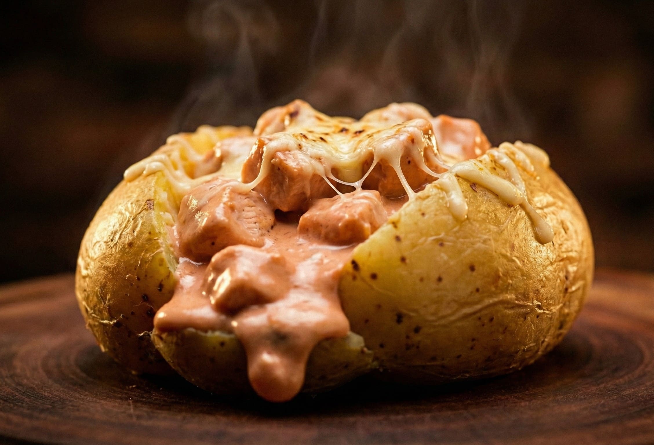 Batata cozida recheada com frango cremoso com queijo.