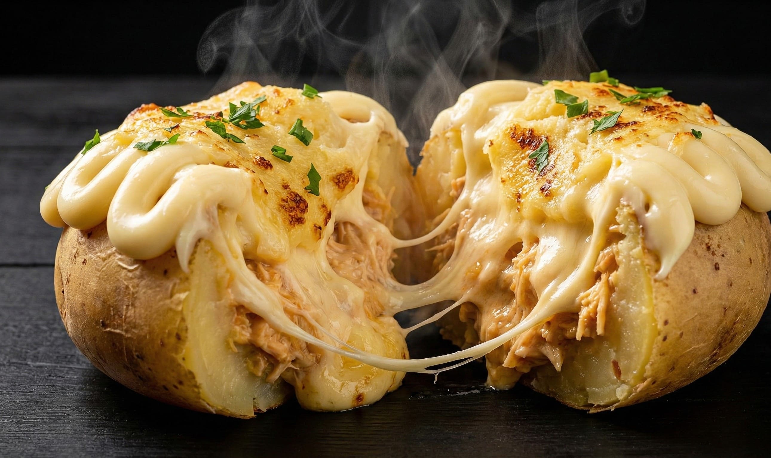 Batata perfeitamente cozida com frango cremoso, mussarela e bacon.