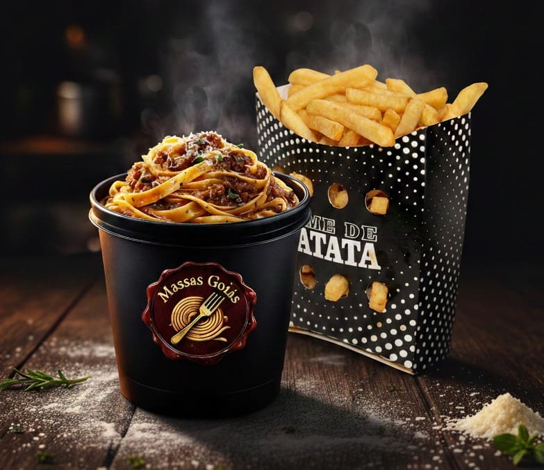 Macarrão Bolonhesa + Porção de Batata Frita 200g.