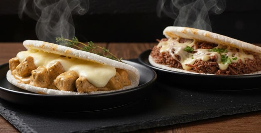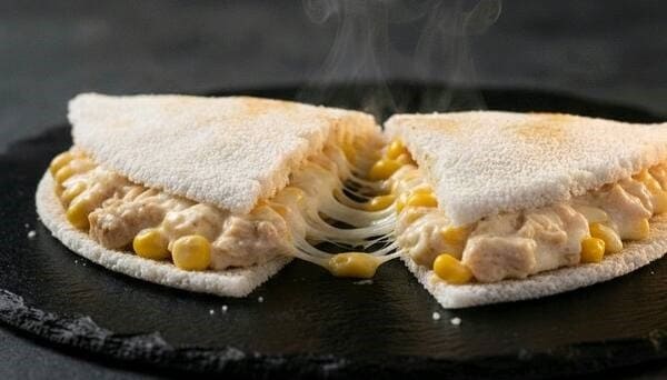 Tapioca Carne Desfiada c/ Mussarela + Tapioca Frango c/ Milho e Catupiry.