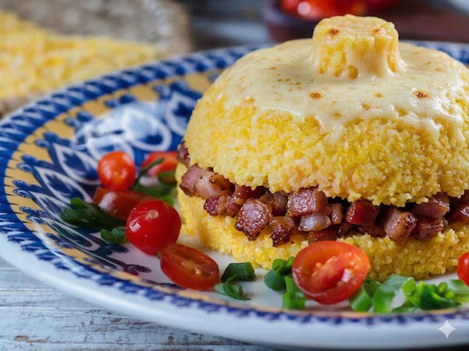 cuscuz recheado com bacon com queijo mussarela.