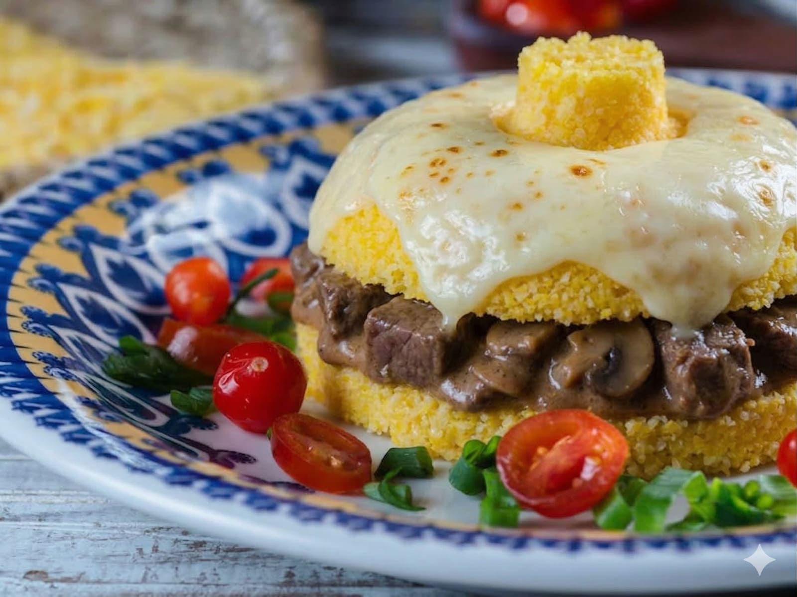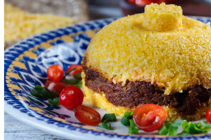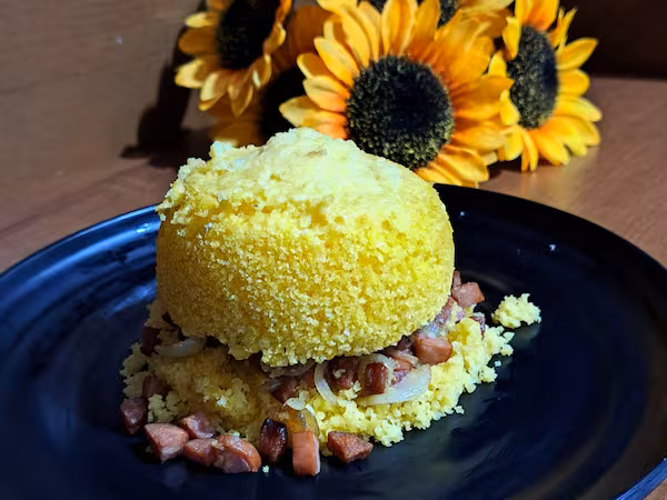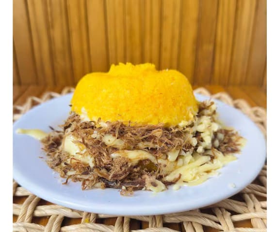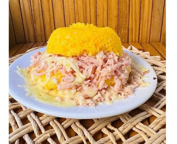 cuscuz recheado com carne seca e queijo mussarela.