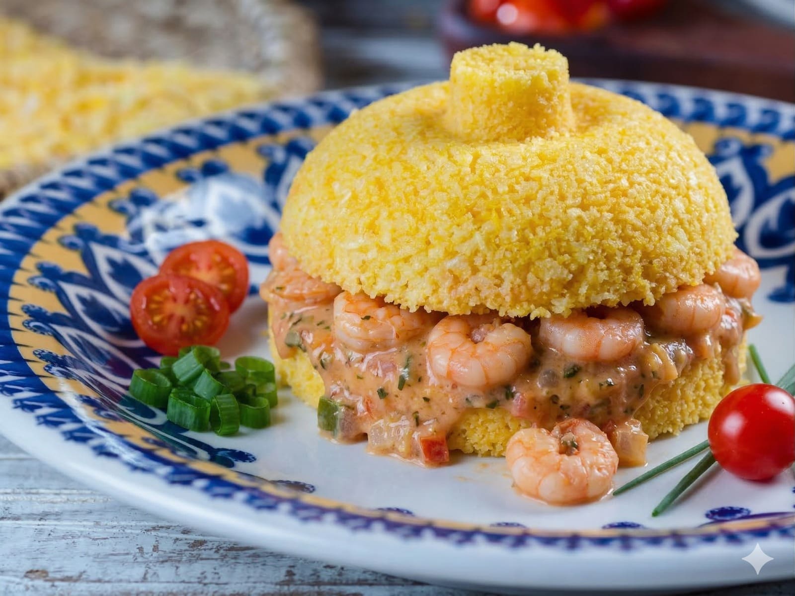cuscuz recheado com camarão ao molho branco.