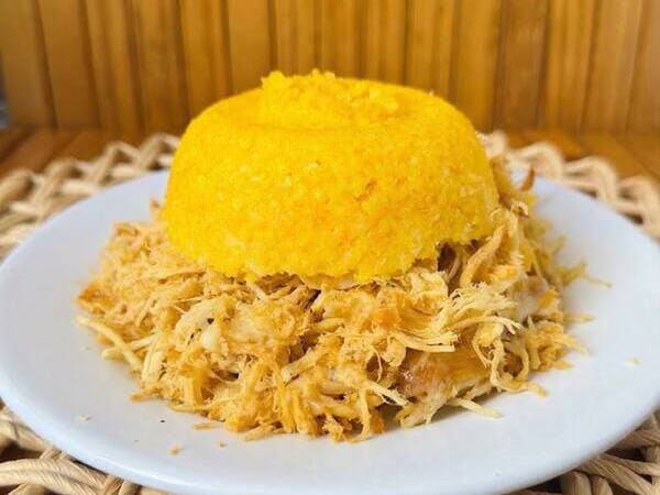 cuscuz recheado com frango desfiado e queijo por cima.