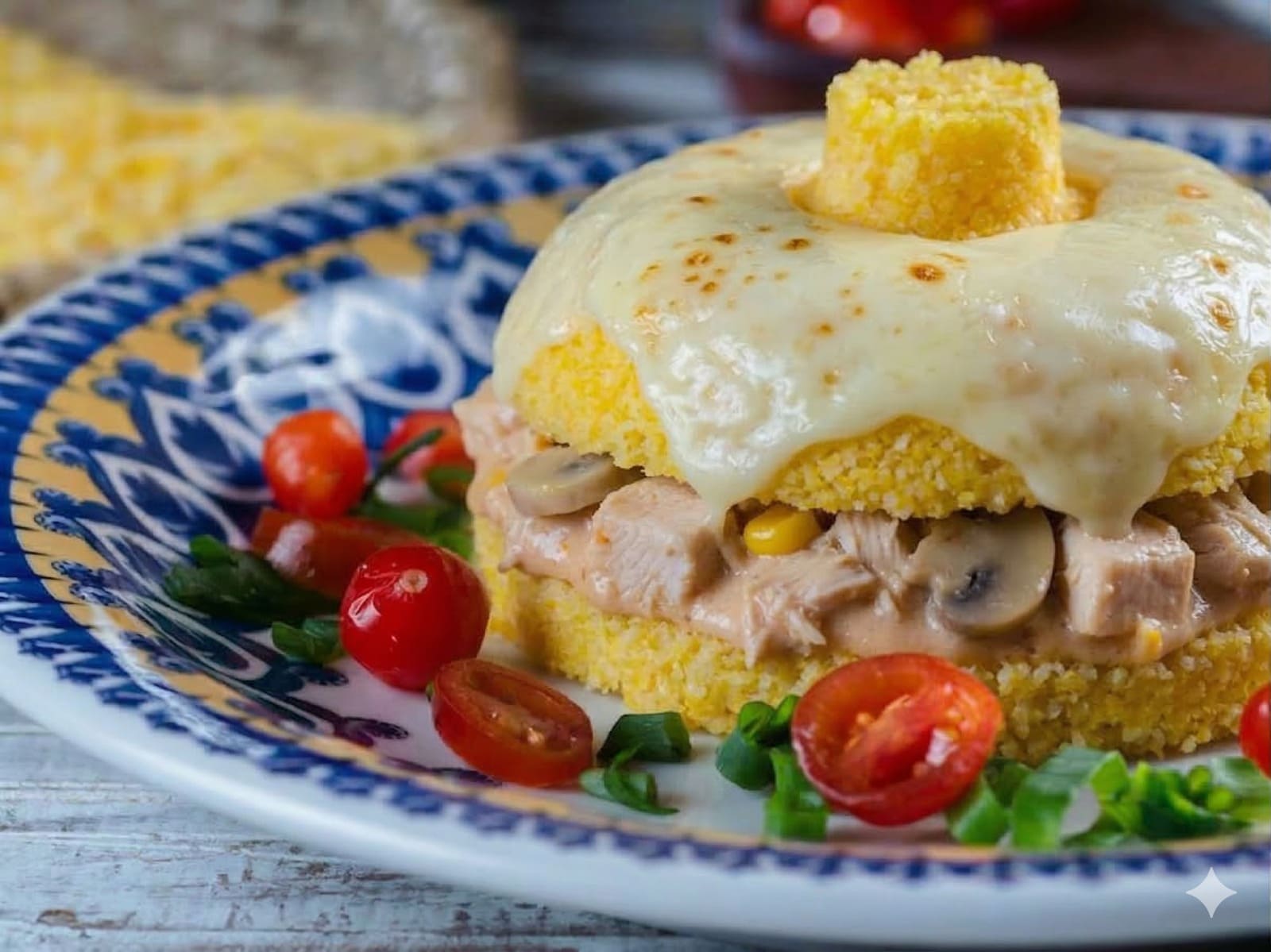 cuscuz recheado com frango cremoso e milho e catupiry peso Aprox 600g.