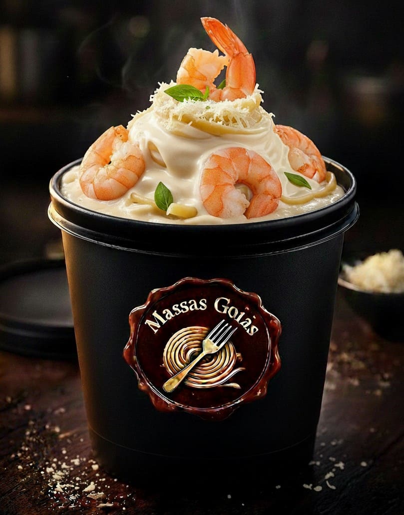 Macarrão tipo talharim acompanhado com molho branco de camarão pote de 500ml.