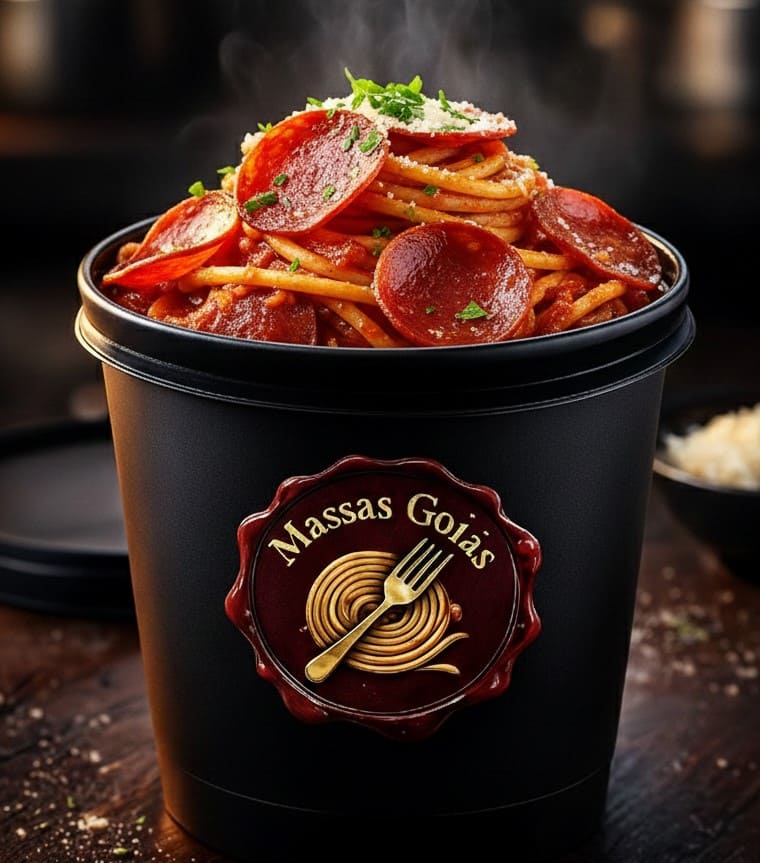 Macarrão tipo espaguete com calabresa no molho vermelho pote de 500ml.