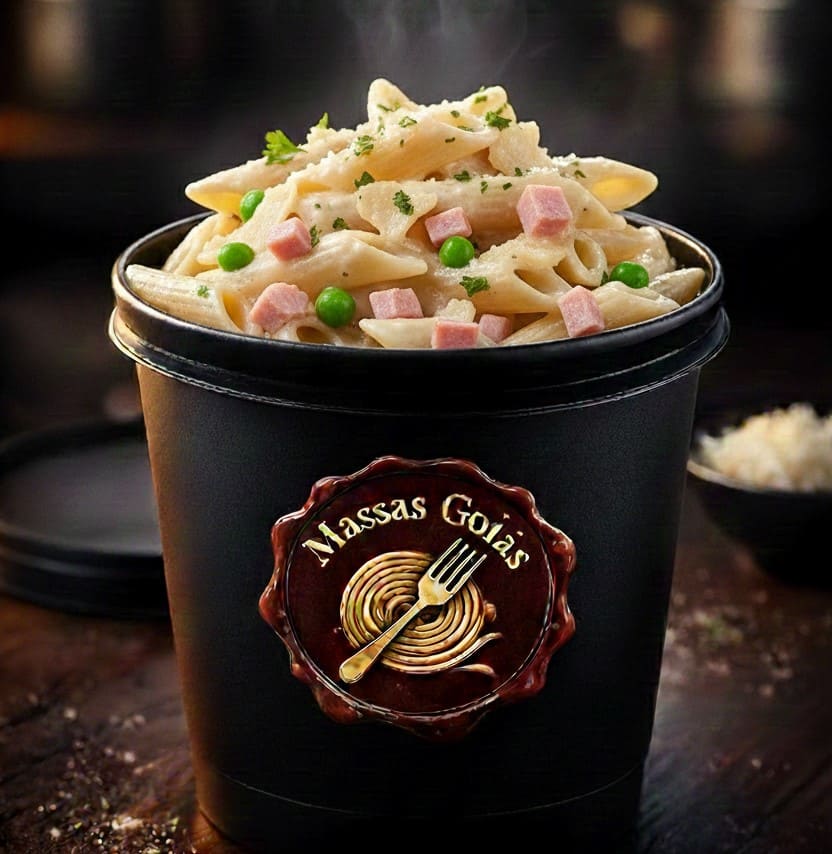 Macarrão tipo penne acompanhado com molho branco, presunto, ervilha, queijo mussarela, pote de 500ml.