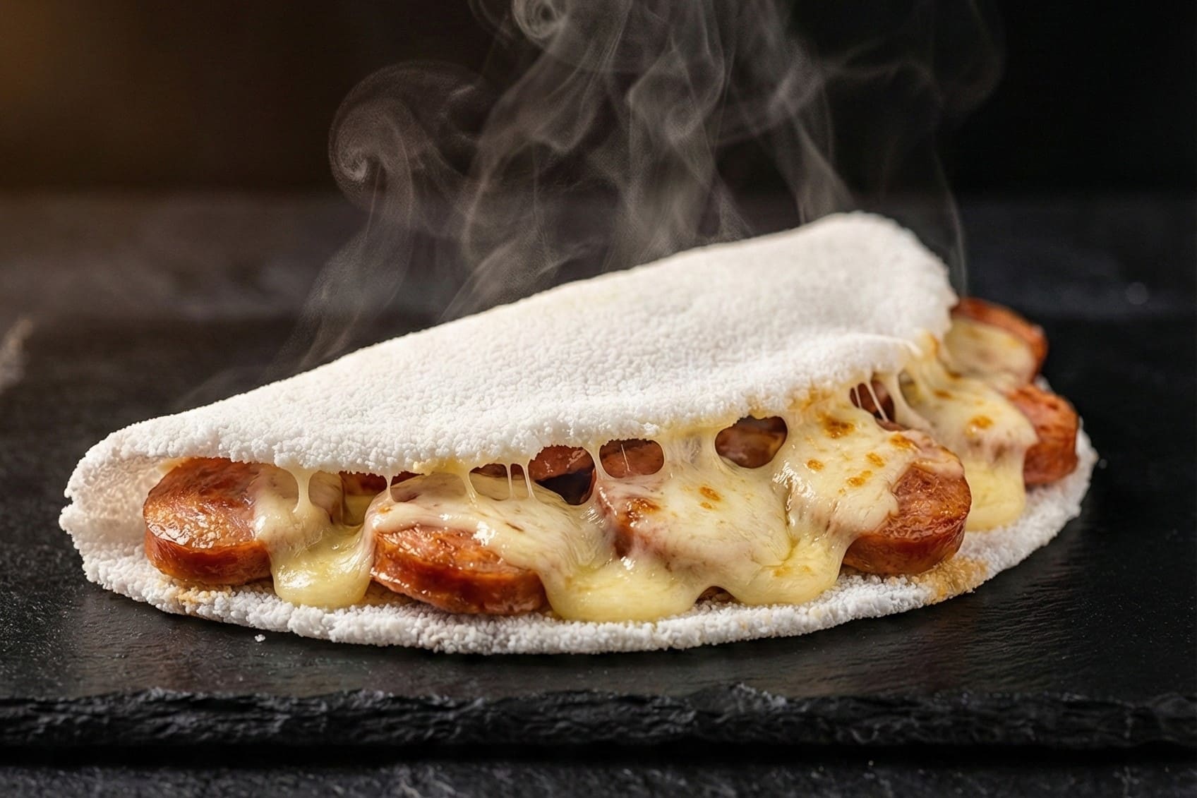 tapioca recheada com calabresa e queijo mussarela.