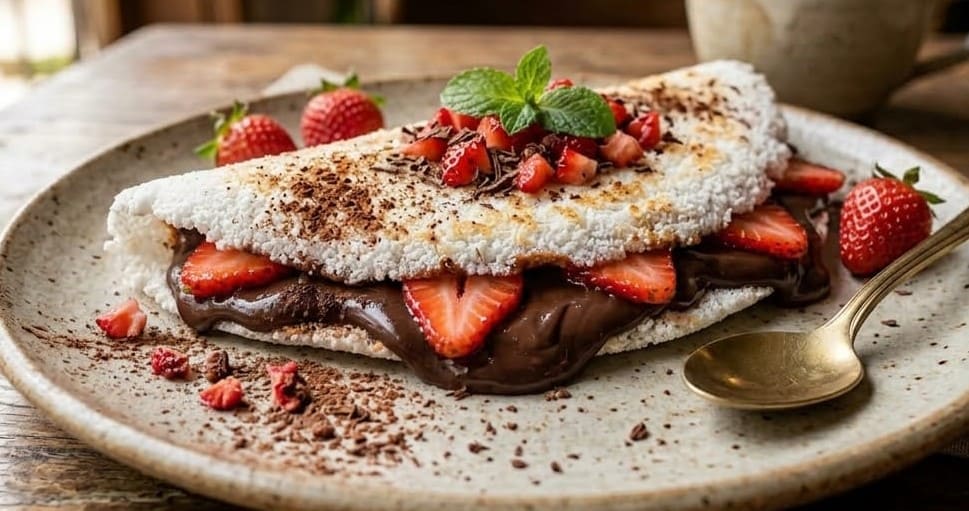 tapioca recheada com chocolate e morango fresco.