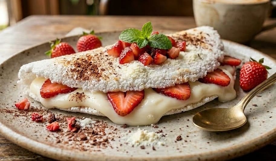 tapioca recheada com ninho e morango fresco.