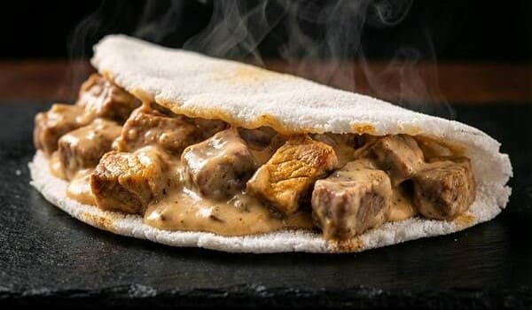 tapioca recheada com strogonoff de carne + mussarela.